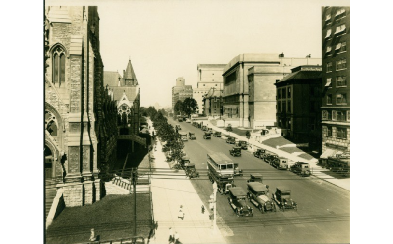 The bus is stopped for the traffic light eastbound on Lindell at Grand. This looks very 1920s. If so, the bus is a People’s Motor Bus before it merged with United Railways, predecessor to St. Louis Public Service Company.
