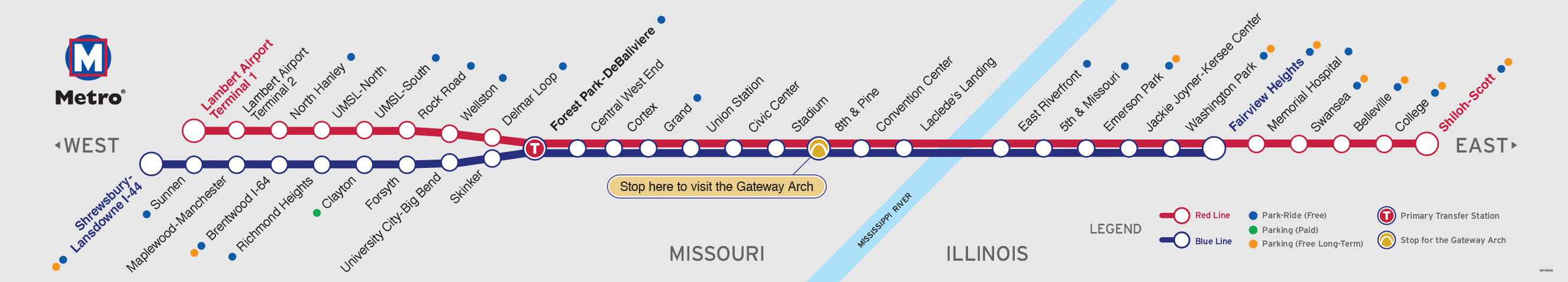 the train cars. Both lines stop at all MetroLink stations between the Forest Park-DeBaliviere Station and the Fairview Heights Station. Transfer to a different train at the Forest Park-DeBaliviere Station if you need to continue on another line.